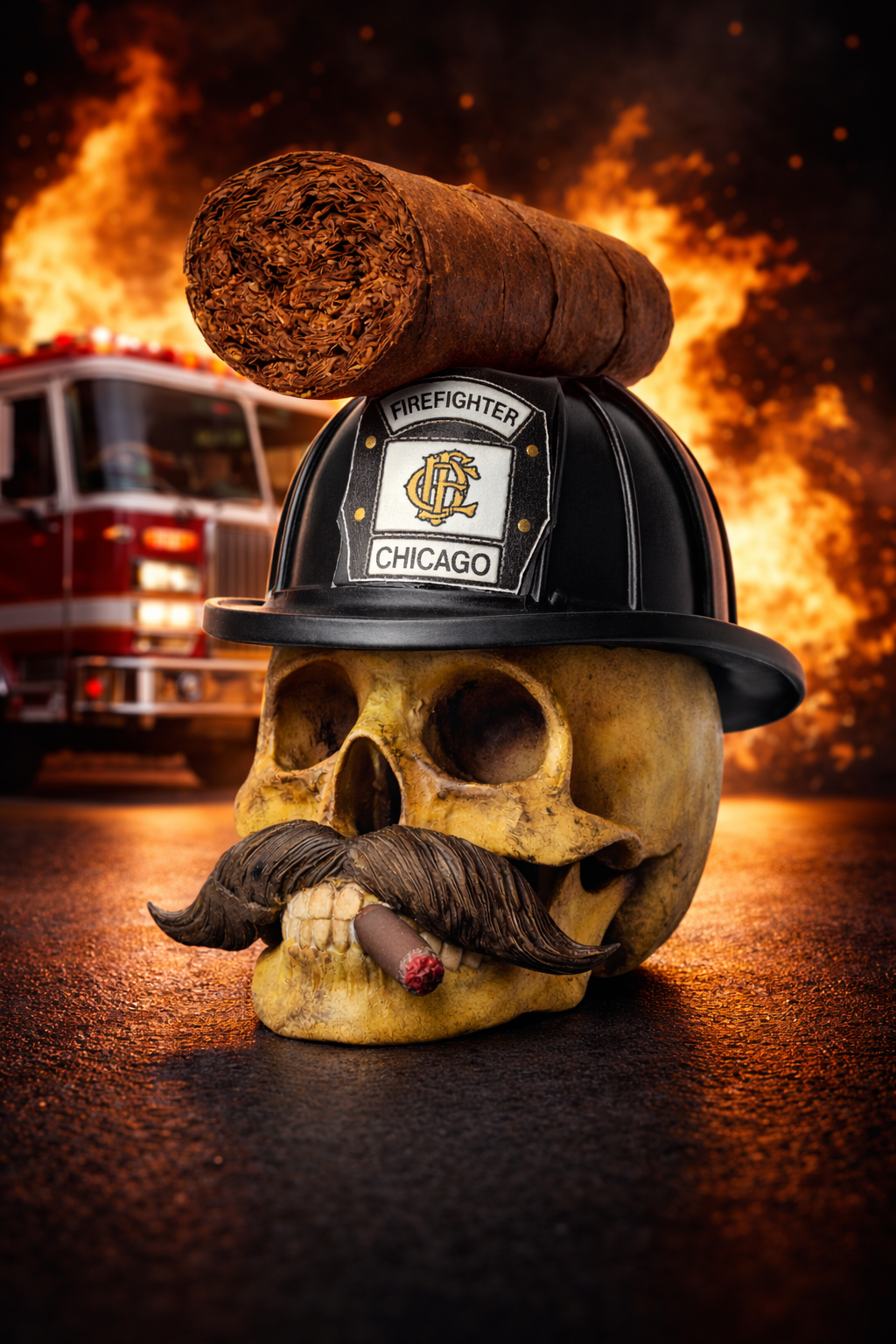 Cette création est une pièce unique, issue d’un véritable travail d’artisanat artistique, mêlant design, culture firefighter et esthétique skull.